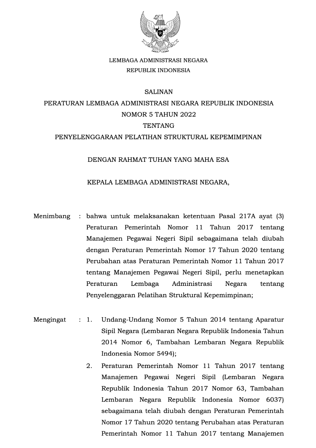 Perlan No. 5 Tahun 2022 tentang Penyelenggaraan Pelatihan Struktural Kepemimpinan