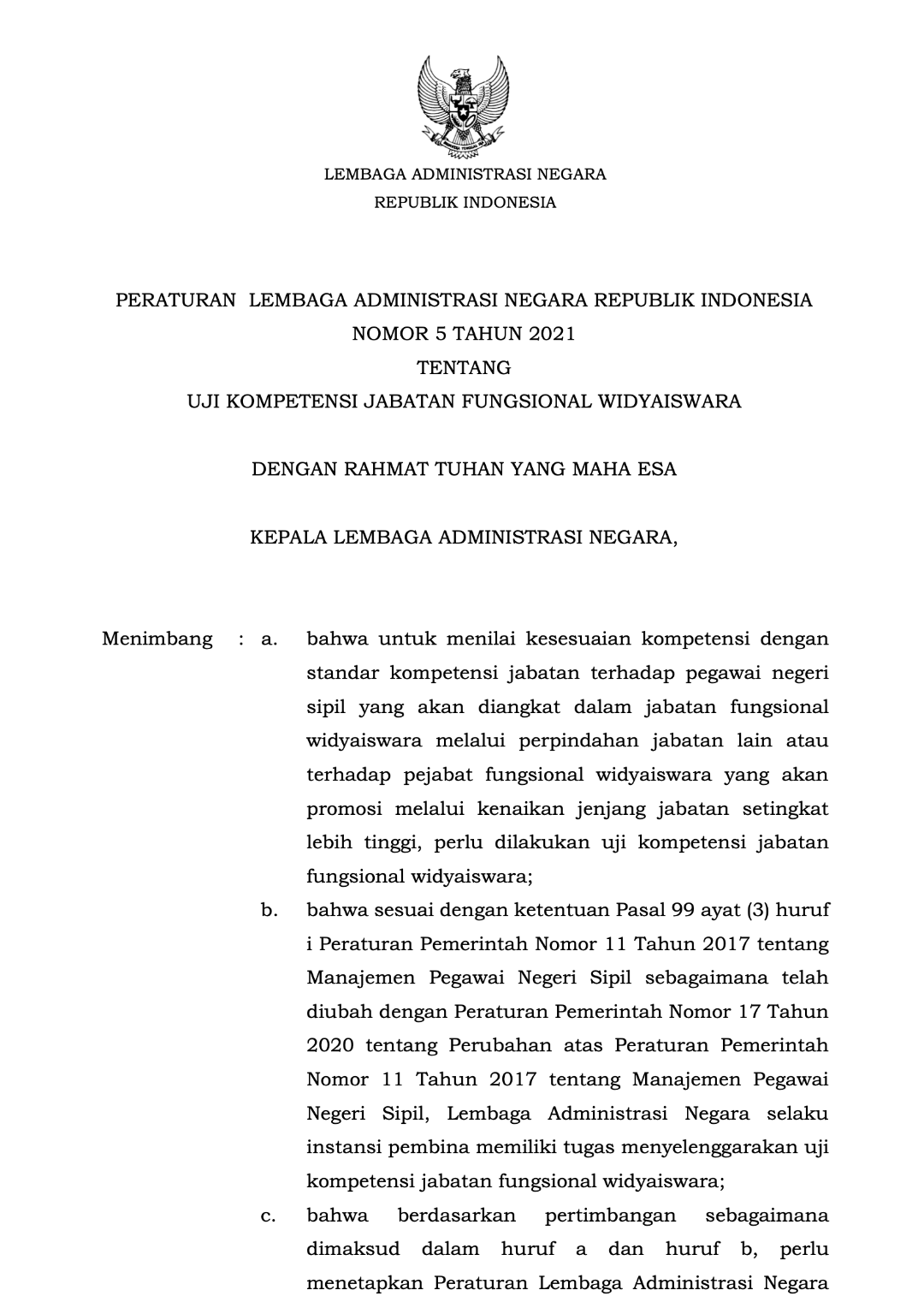 Perlan No. 5 Tahun 2021 tentang Uji Kompetensi Jabatan Fungsional Widyaiswara