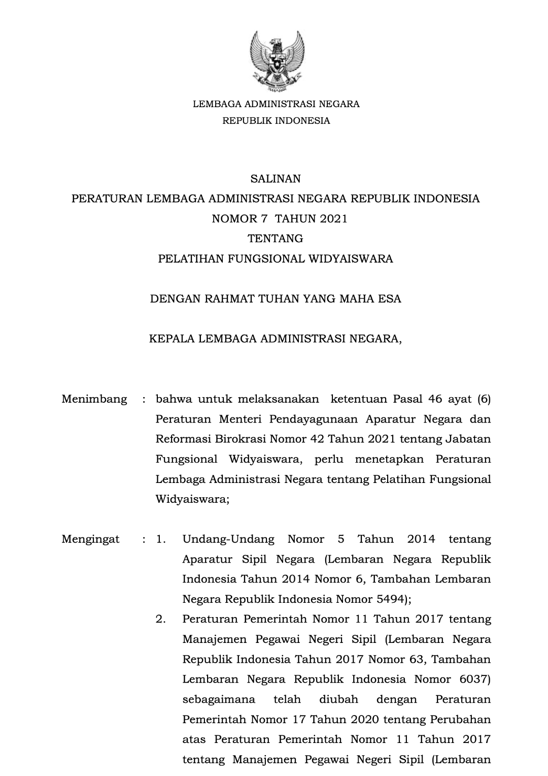 Perlan No. 7 Tahun 2021 tentang Pelatihan Fungsional Widyaiswara