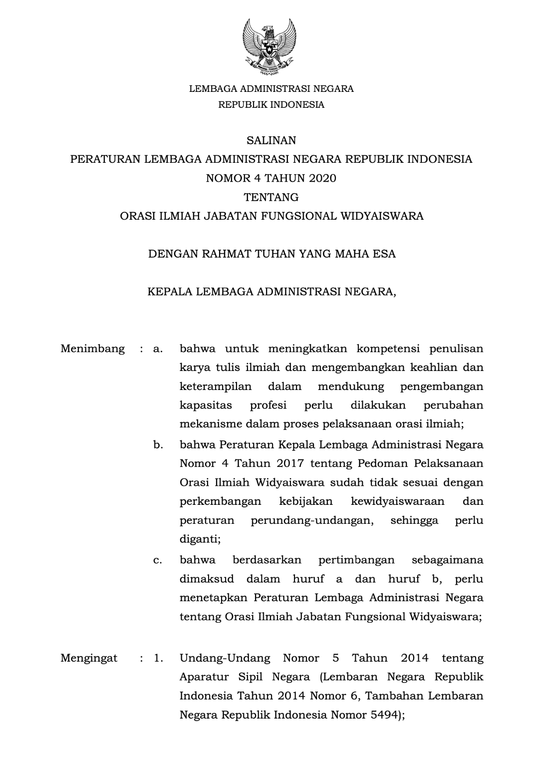Perlan No. 4 Tahun 2020 tentang Orasi Ilmiah Jabatan Fungsional Widyaiswara