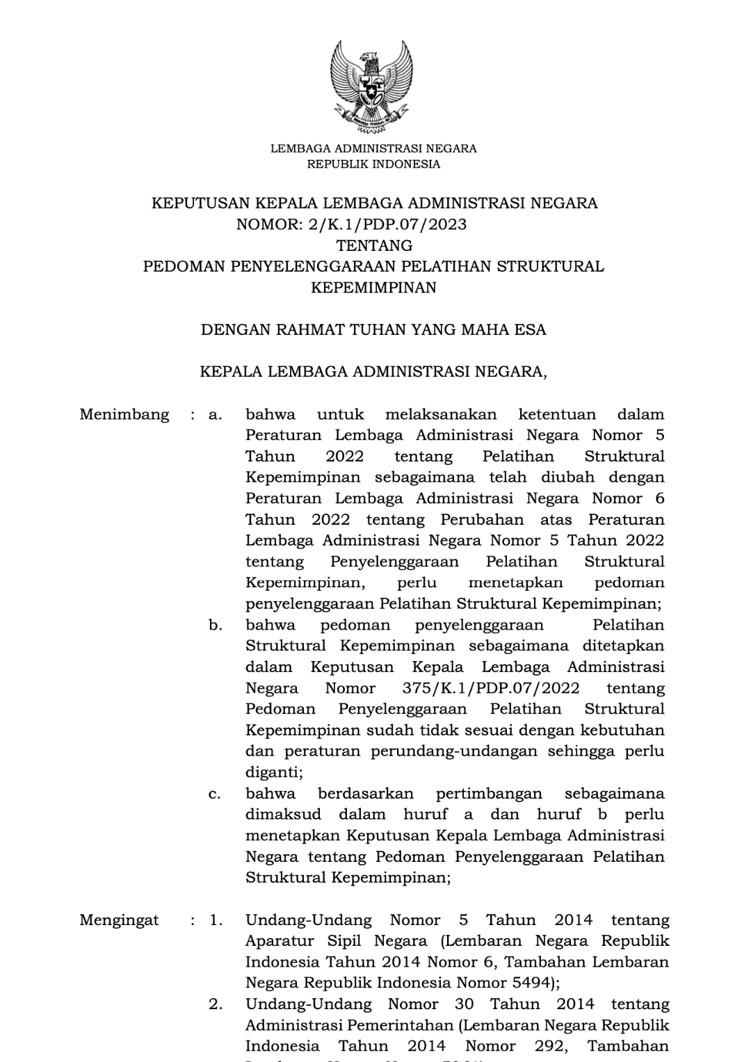 Keputusan Kepala LAN No. 2 Tahun 2023 tentang Pedoman Penyelenggaraan Pelatihan Struktural Kepemimpinan