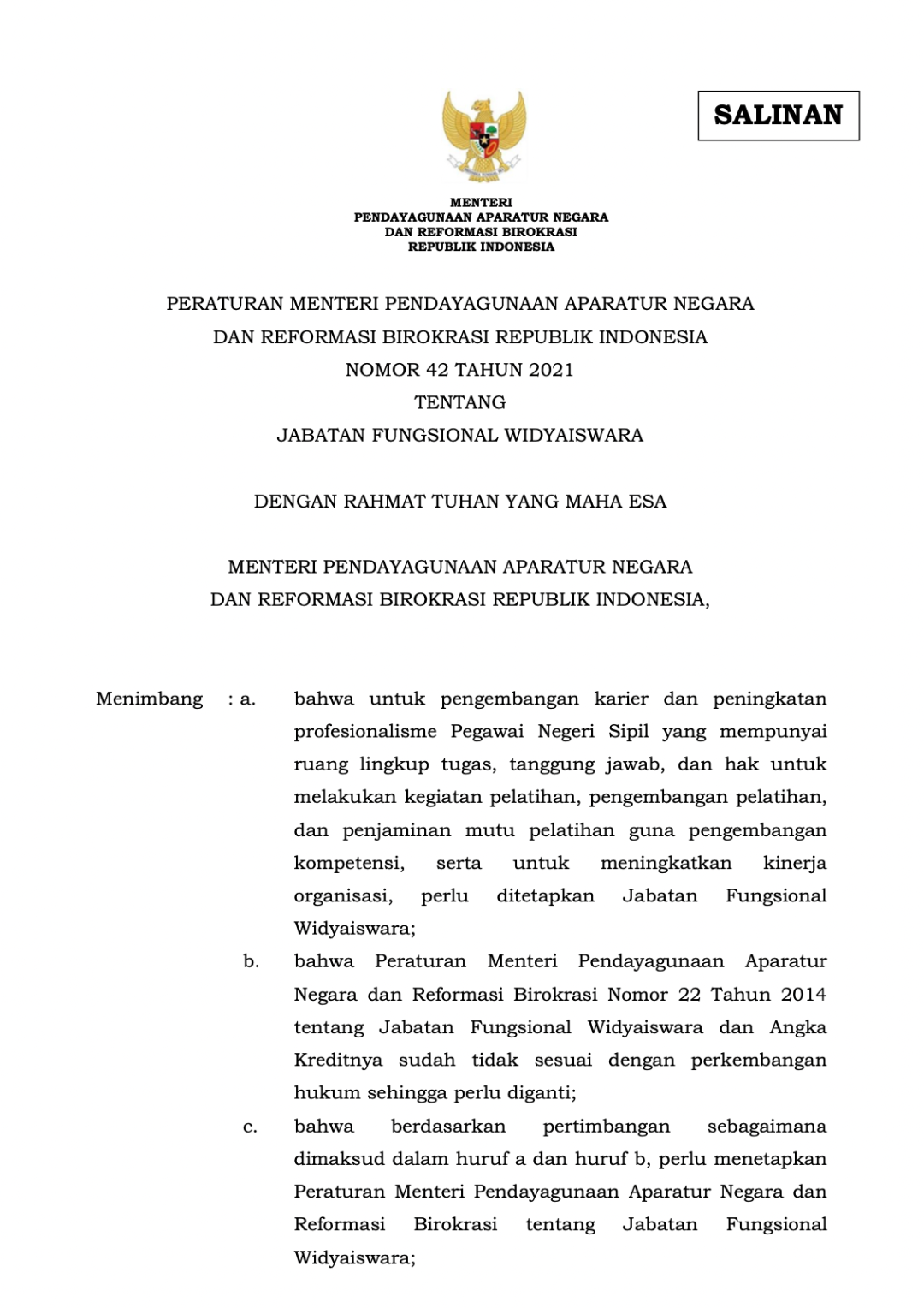 PermenPAN RB No 42 Tahun 2021 tentang Jabatan Fungsional Widyiaswara