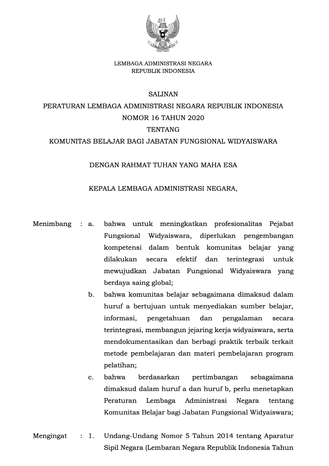 Perlan No. 16 Tahun 2020 tentang Komunitas Belajar bagi Jabatan Fungsional Widyaiswara