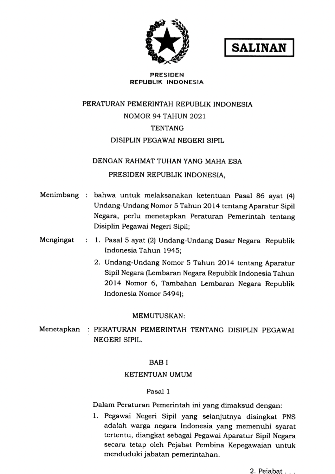 PP No. 94 Tahun 2021 tentang Disiplin Pegawai Negeri Sipil
