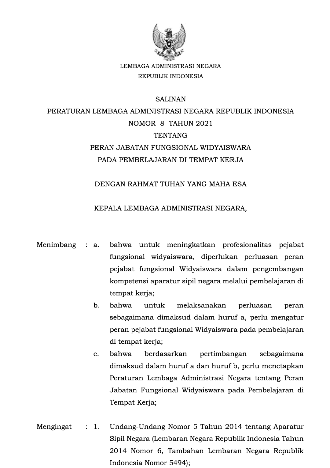 Perlan No. 8 Tahun 2021 tentang Peran Jabatan Fungsional Widyaiswara pada Pembelajaran di Tempat Kerja