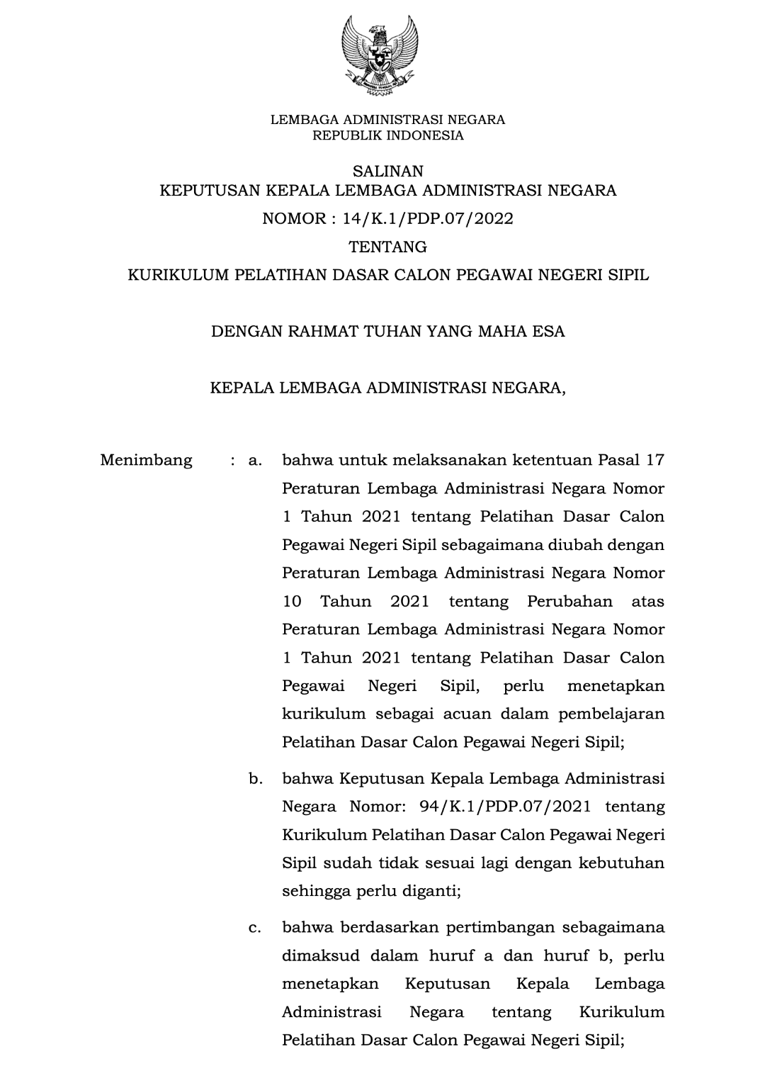 Keputusan Kepala LAN No. 14 Tahun 2022 tentang Kurikulum Pelatihan Dasar CPNS