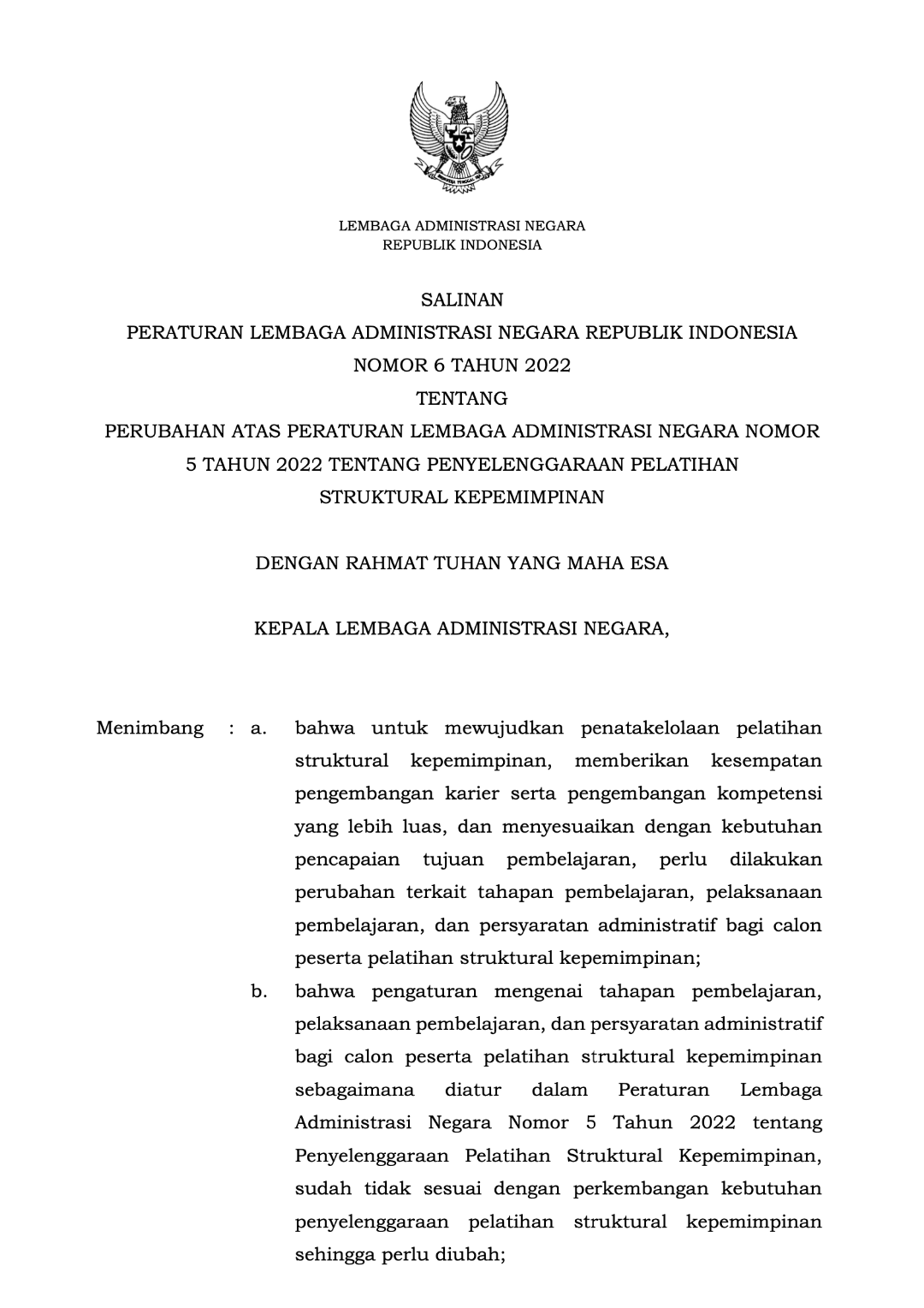 Perlan No. 6 Tahun 2022 tentang Perubahan Perlan No. 5 Tahun 2022 tentang Penyelenggaraan Pelatihan Struktural Kepemimpinan